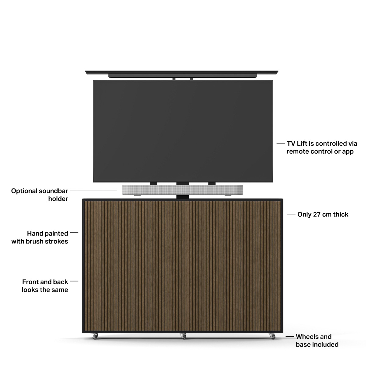 Ce meuble élévateur est également doté d'une fonction anti-collision intégrée qui protège à la fois le téléviseur et le décor environnant. Il peut être contrôlé à l'aide de la télécommande fournie.