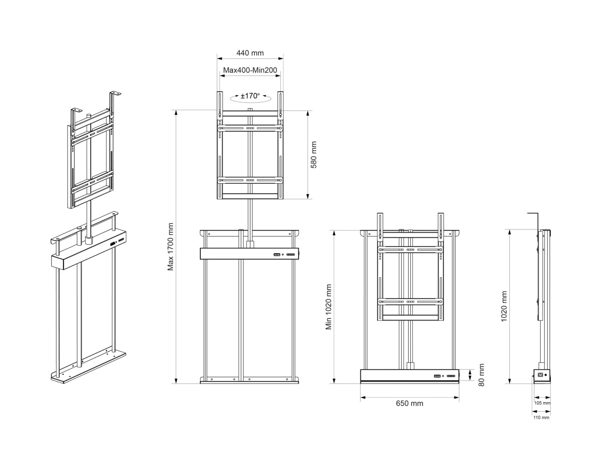 Conçu pour offrir une grande flexibilité et s'intégrer parfaitement dans les salles de réunion, les espaces de vie ou les environnements commerciaux. Avec une course verticale de 880 mm et une fonctionnalité pivotante, il offre un réglage de la hauteur et de l'angle de visionnage.