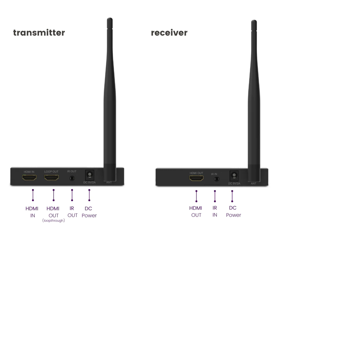 Le TV Anywhere Wireless HD 2 est composé d’un transmetteur (transmitter) et d’un récepteur (receiver). Vous connectez le transmetteur à n’importe quelle source HDMI, telle qu’un décodeur TV, un PC média center ou un lecteur Blu-ray. Vous connectez le récepteur au (2ème) téléviseur et l’installation est prête pour une transmission HDMI sans fil !